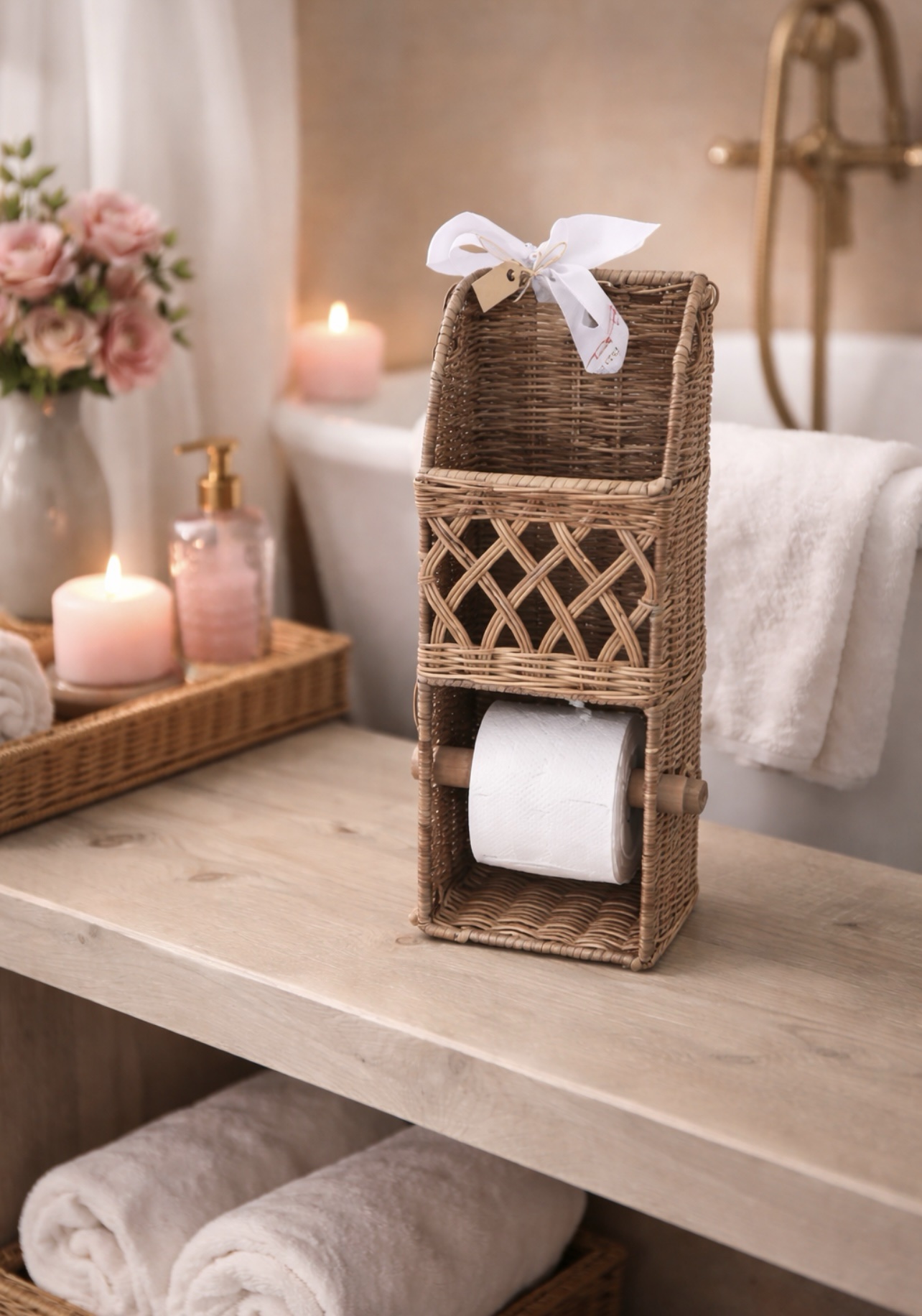De toiletrolhouder riet is sfeervol in het toilet. De houder heeft ook ruimte voor een krantje of magazine.