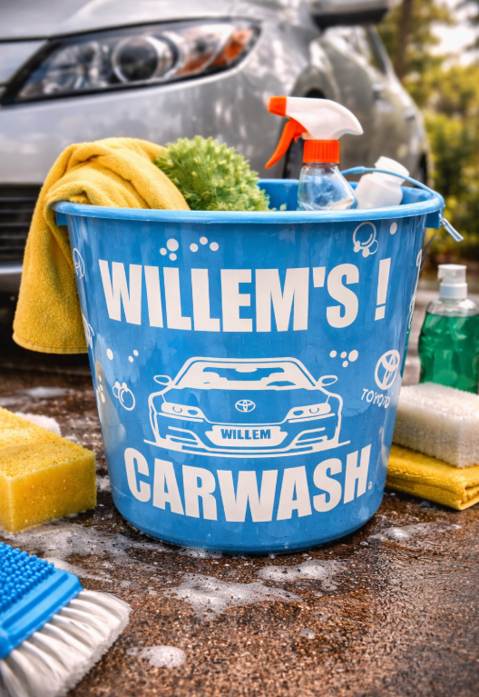 Deze Auto Poets Emmer met Naam kan bedrukt worden met jouw naam én (optioneel) het merk of type van je auto.