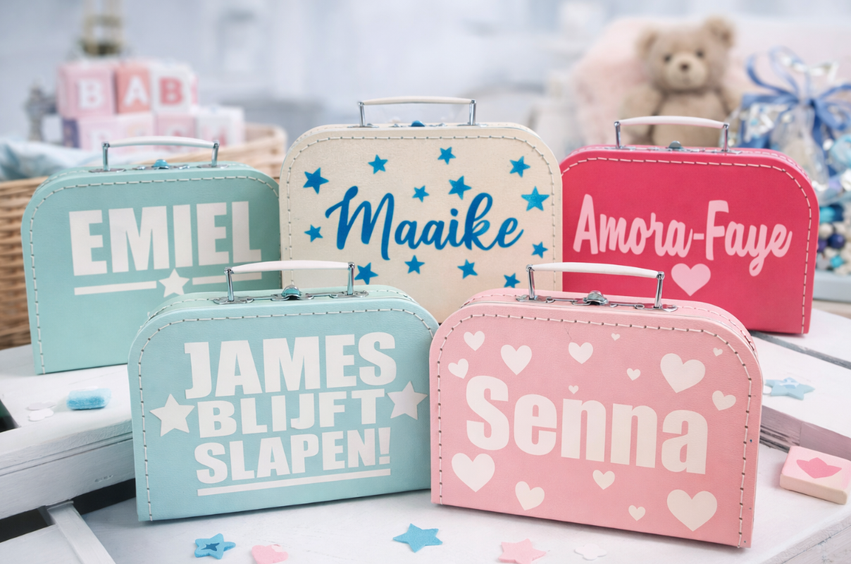 Denk aan een lieve wens, een grappige zin of een korte boodschap speciaal voor het kind. Zo wordt het koffertje niet alleen mooi van buiten, maar ook een warme verrassing van binnen.