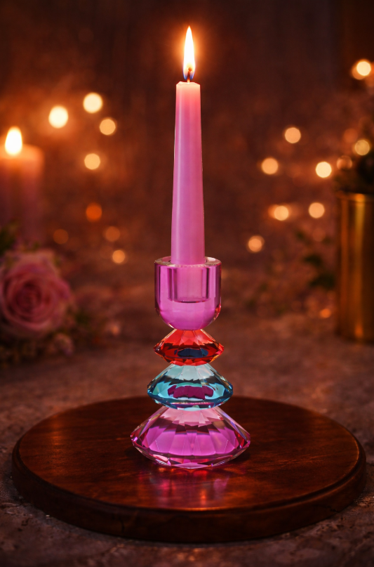 Deze veelkleurige glazen kandelaar is een compact maar opvallend decoratie-item dat direct sfeer toevoegt aan je interieur. Het speelse, gelaagde ontwerp in verschillende tinten geeft de kandelaar een luxe en moderne uitstraling. Door de facetten vangt het glas het kaarslicht prachtig, wat zorgt voor een warm en stijlvol lichteffect.