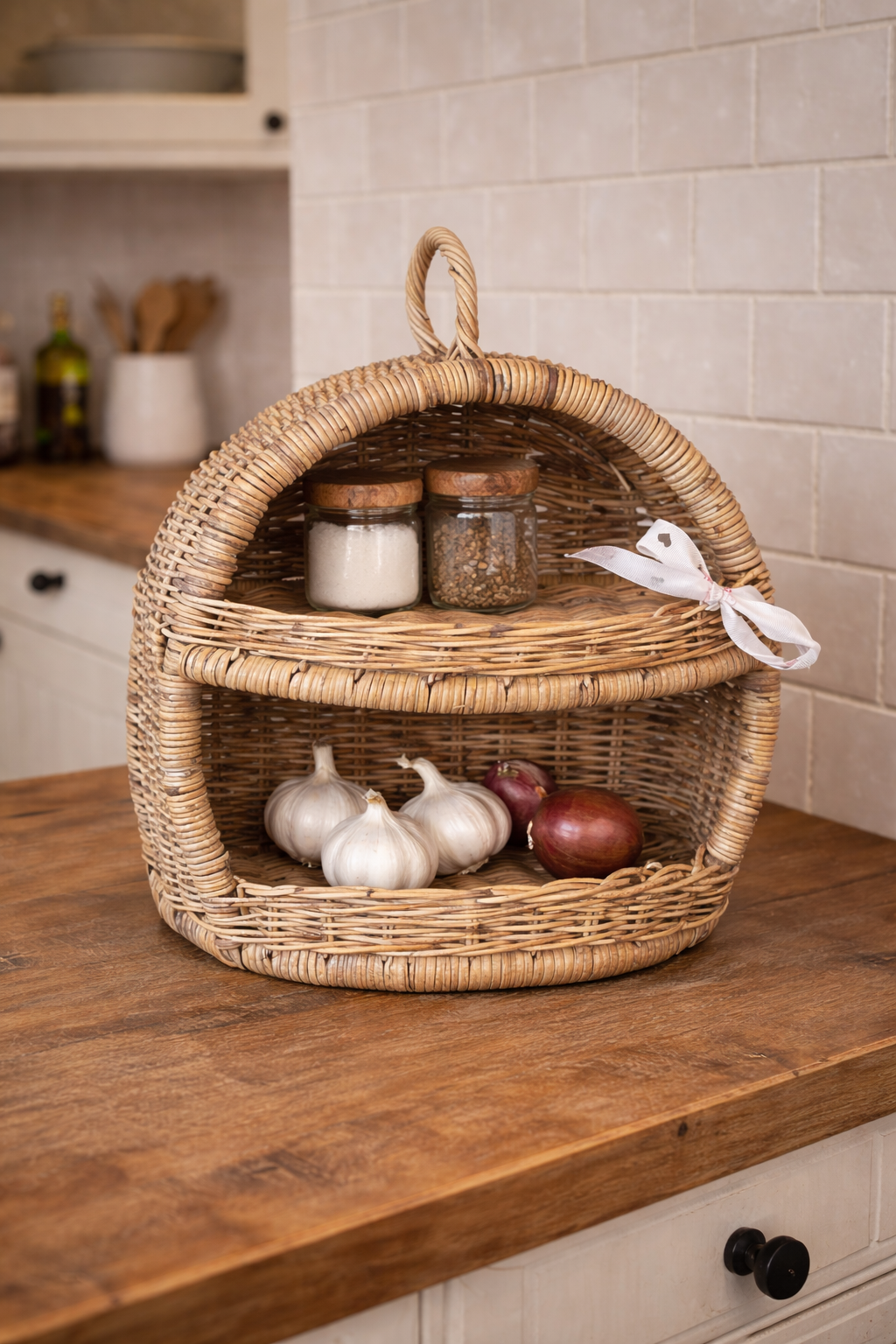 De twee lagen bieden overzichtelijke opbergruimte voor bijvoorbeeld zout en peper, uien, knoflook, fruit of andere keukenbenodigdheden. Alles krijgt een vaste plek, terwijl de keuken rustig en stijlvol oogt.