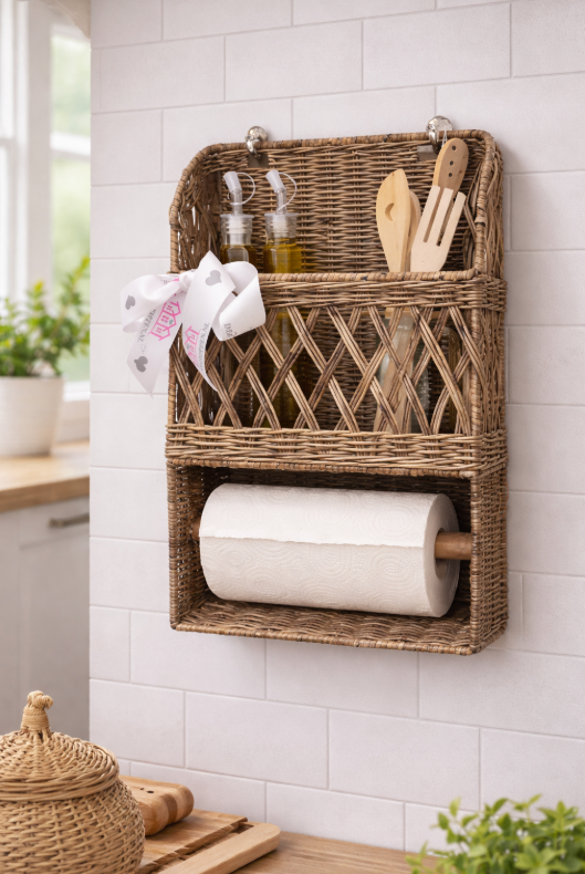 De rieten keukenrolhouder met opbergvak is een functionele én decoratieve oplossing voor de keuken.